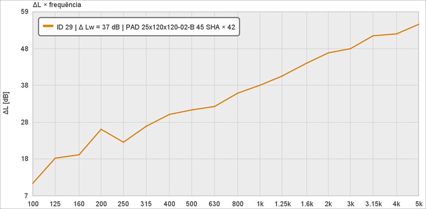Com base em ensaios realizados com peças de geometria, material e faixa de rigidez semelhantes, o desempenho de isolamento acústico do PAD 25×90×90 situa-se, de forma conservadora, na faixa de 37 a 40 dB. Esse resultado foi obtido a partir da análise do comportamento em frequência de soluções já testadas, considerando principalmente o regime de excitação típico de academias, com impactos repetitivos e elevada participação de baixas frequências.