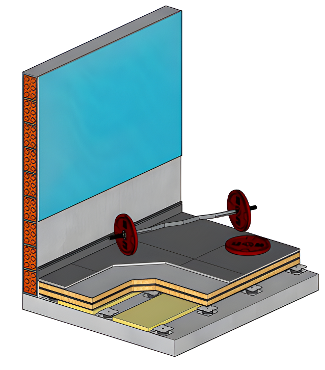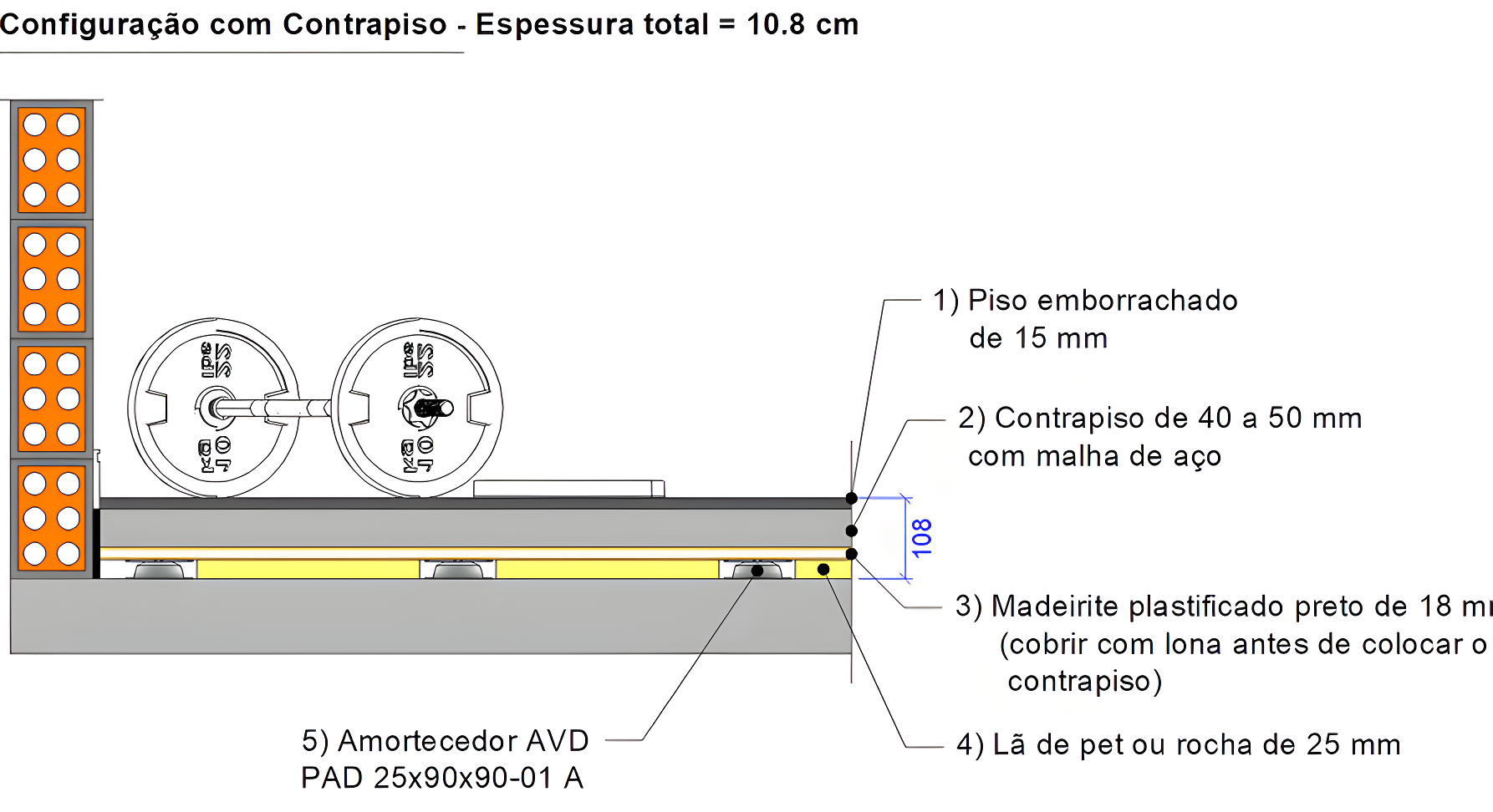 Na configuração com contrapiso, indicada para aplicações em fase de obra, o sistema de isolamento com o PAD 25×90×90 é integrado diretamente à estrutura do piso, resultando em uma solução mais compacta e economicamente vantajosa, com espessura total aproximada de 10,8 cm. Os amortecedores AVD são posicionados sobre a laje estrutural e trabalham em conjunto com uma camada resiliente de lã de PET ou lã de rocha, responsáveis pela desacoplagem estrutural e controle das vibrações de baixa frequência geradas por quedas de peso e impactos intensos típicos de academias.