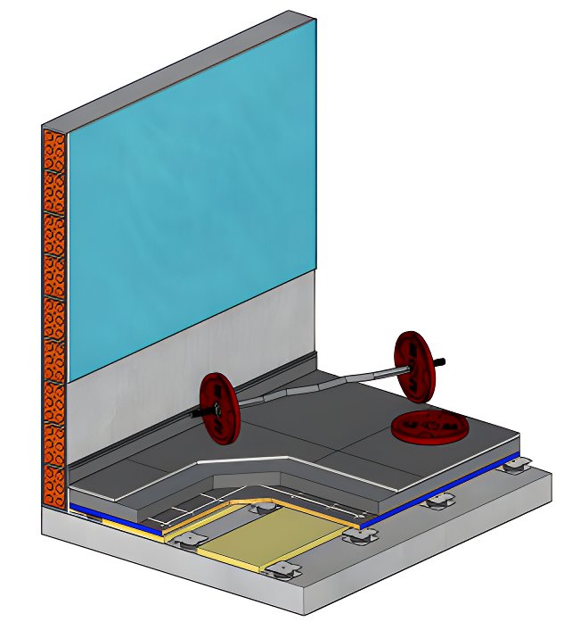 É fundamental que o sistema não encoste em paredes, pilares ou elementos estruturais, mantendo sempre uma folga perimetral, a qual deve ser preenchida com lã de PET ou lã de rocha de 25 mm, evitando pontes acústicas. Sobre os painéis é aplicado o piso emborrachado, responsável pela proteção superficial e conforto ao usuário, enquanto o isolamento eficaz de vibração é garantido pelo conjunto painel + lã + amortecedores. O detalhamento correto dessas interfaces é essencial para garantir o desempenho do sistema, especialmente em aplicações com quedas de peso e excitações de baixa frequência.