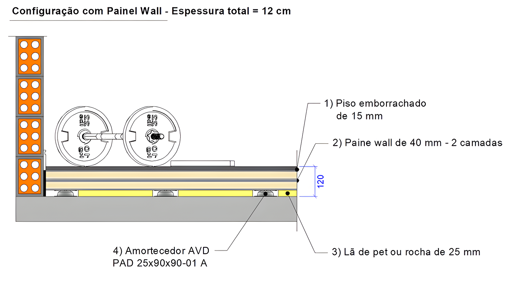 Na configuração com Painel Wall, indicada principalmente para obras existentes e situações de retrofit, o sistema é composto por duas camadas de painéis Wall de 40 mm, sistemas sobre os amortecedores AVD PAD 25×90×90 , formando um conjunto desacoplado da laje estrutural, com espessura total aproximada de 12 cm. Os painéis devem ser instalados com as emendas desencontradas entre as camadas, garantindo melhor distribuição de carga, maior prejuízo do conjunto e evitando caminhos preferenciais de transmissão de vibração.
